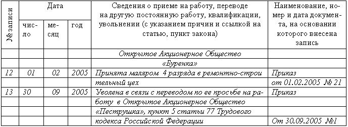 Pсведения о работе (прием на работу, перевод на другую постоянную работу, увольнение со ссылками на соответствующие приказы);